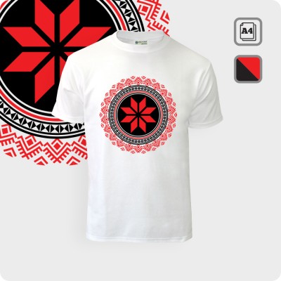 Рисунок оберега Алатырь выполняется на футболке методом сублимационной термопечати на сэндвич ткани, что обеспечивает долговечность и износостойкость. Краски яркие и насыщенные. Стойкость от выстирывания.